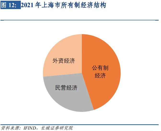 上海民营经济占比低于全国水平,但其外资经济非常活跃。2021年,上海市民营经济增加值占全市GDP的28.5%,显著低于全国水平(60%以上[1])。但是上海外资经济占全市GDP比重超25%, 非公有制经济占比55.0%。