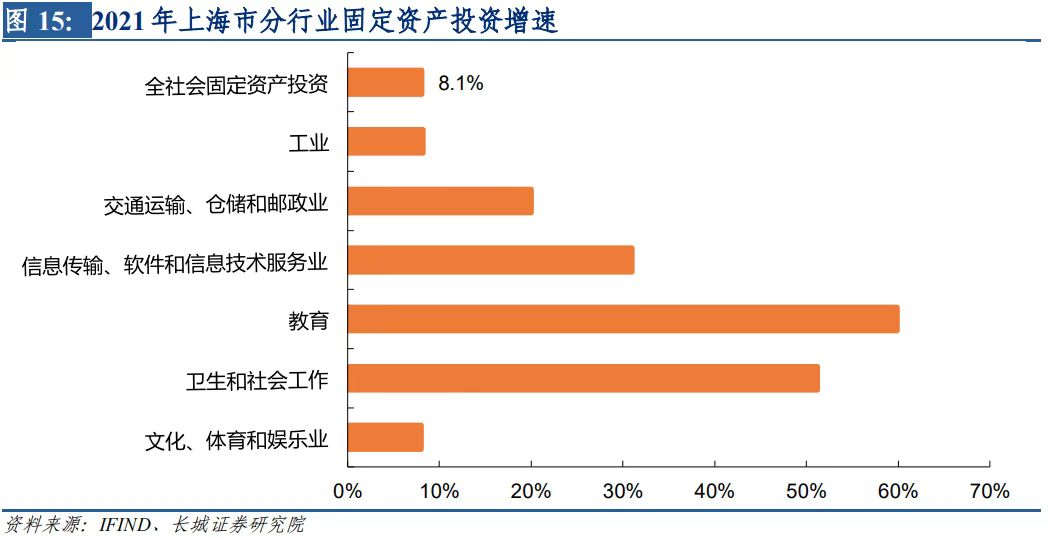 从投资结构来看,上海市工业、房地产投资增长稳定,对外商投资的吸引力强,服务业投资成绩亮眼。近五年来,上海市工业投资、房地产开发投资增势良好。其中2021年,上海市工业投资在电力生产、医药制造等领域的推动下实现同比增长8.2%,其中聚焦电子信息产品、新能源汽车、生物医药等领域的制造业投资增长7.8%;房地产开发投资增长7.2%。值得一提的是,上海作为我国对外开放程度较高的城市,对外资有着很强的吸引力。2021年上海市外商直接投资实际到位金额225.51亿美元,同比增长11.5%。而服务业是上海市拉动投资、吸引外资的主力军。2021年,上海市第三产业投资比上年增长8个百分点,其中,交通运输、仓储和邮政业,信息传输、软件和信息技术服务业,教育,卫生和社会生活投资分别同比增长20%、31%、59.9%和51.2%,服务业外商直接投资实际到位金额215.30亿美元,同比增长12.7%,占比上升至95.5%。