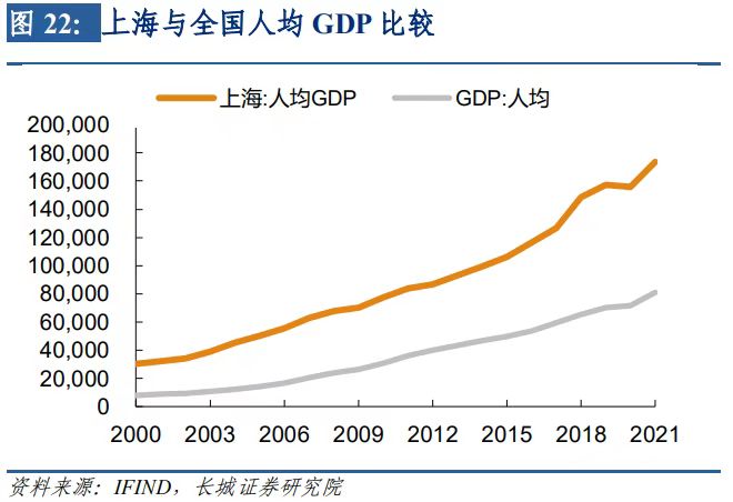 作为中国的经济、金融、贸易、航运中心,上海具有较好的经济基础。2021年,上海市以4.32万亿的经济总量继续位列全国第十,占全国GDP总量的3.8%。以美元兑人民币平均汇率6.45计算,约为6699.98亿美元,超出瑞典(6356.6亿美元)。同时,上海人均GDP相较于江苏(13.7万元)、福建(11.7万元)、浙江(11.3万元)、广东(9.8万元)等其他经济大省来说也相对较高,2021年为17.4万元,明显高于全国平均水平(8.1万元),仅次于北京(18.4万元)。