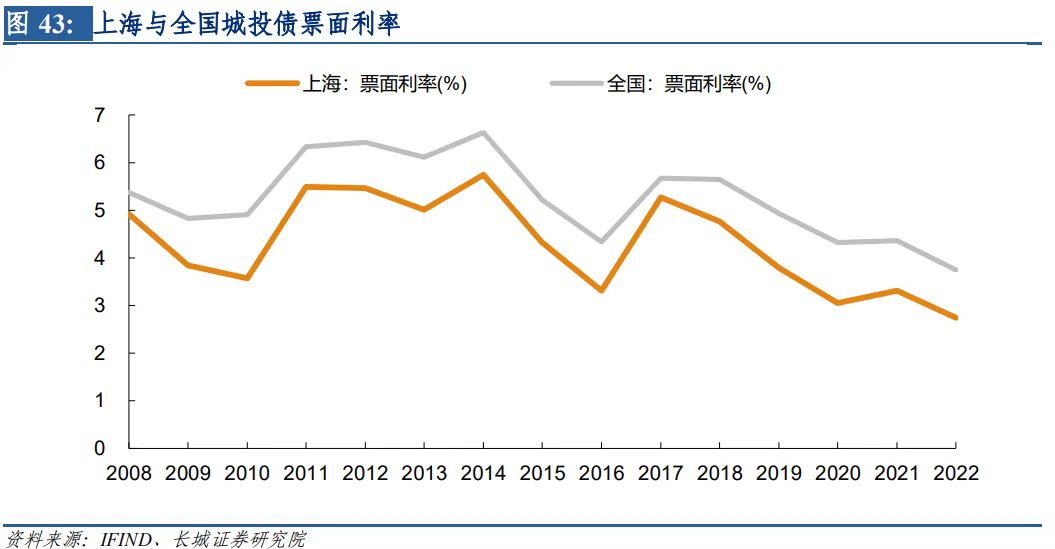 2018年以来,全国城投债票面利率处于持续下滑态势。同花顺数据显示,2021年全国城投债票面利率为4.36%,较2018年下滑128BP;近十年来,上海城投债利率与全国城投债利率呈现相近的下滑趋势,较2018年下滑145BP至3.31%,发行成本进一步压缩。今年截至10月29日,上海城投债票面利率为2.74%,比同期全国利率低100BP。