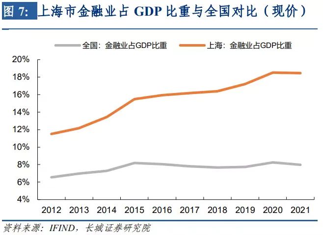 金融业作为上海经济增长的重要支柱,对上海经济的拉动作用不断增强。2012年以来,依托于上海金融中心地位,上海市金融业增加值从2450.36亿元上升至2021年的7973.25亿元,复合年均增速为12.52%。金融业增加值占GDP的比重从2012年的11.50%增长至2021年的18.45%,不仅持续上升,而且明显高于全国平均水平,差距不断扩大。近十年来,上海国际金融中心建设取得重大进展,金融总量大幅上升,金融中心核心功能也不断增强,是目前国际上金融市场种类最齐全的城市之一。2022年9月22日全球金融中心指数报告(GFCI 32)发布,上海排名由2015年的第21位跃升至第6位,上海市金融业发展水平已位于全球前列。