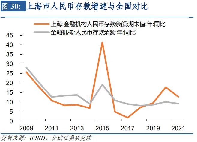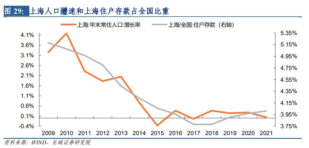 通过观察上海住户存款占全国比重和上海市人口增速之间的关系,我们发现从2010年到2021年,上海市对资金的吸引与对人口的吸引整体较为一致。2010-2015年上海市住户存款占全国的比重从5.07%下降到4.06%,而这段时期上海人口增速整体呈现下滑趋势。在2016年及其之后上海人口增速稳定在-0.04%到0.37%这一区间内,上海市住户存款占全国比重也稳定在3.9%附近。