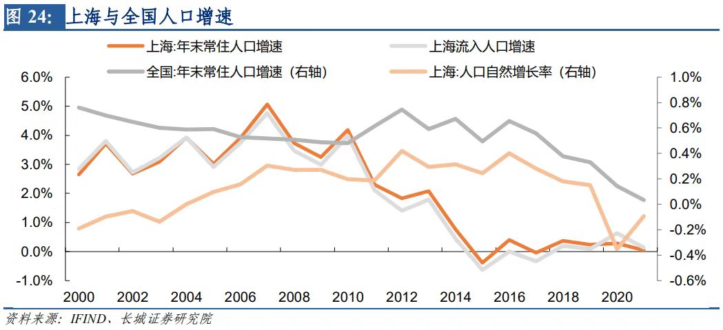 上海人口自然增长率长期低于全国水平,并且2020年、2021年连续负增。因此上海常住人口的变化主要由人口流动主导,2015和2017两年常住人口负增,可能主要是受政策引导。上海市委2015年发布的《中共上海市委关于制定上海市国民经济和社会发展第十三个五年规划的建议》提出,上海“十三五”必须牢牢守住常住人口规模底线。根据党的十八届三中全会提出的严格控制特大城市人口规模,规划建议,把常住人口不超过2500万作为长期调控目标。相对比较严格的户籍政策也限制了人口大幅流入。2016年上海市人民政府发布的《关于进一步推进本市户籍制度改革的若干意见》支出要坚持人口总量调控、结构优化。严格控制人口规模,综合解决人口总量、结构、布局问题。完善落户政策,逐步建立积分落户,合理调控户籍人口机械增长。另外,近年上海产业加速升级,也导致部分低端制造业从业人员流出。