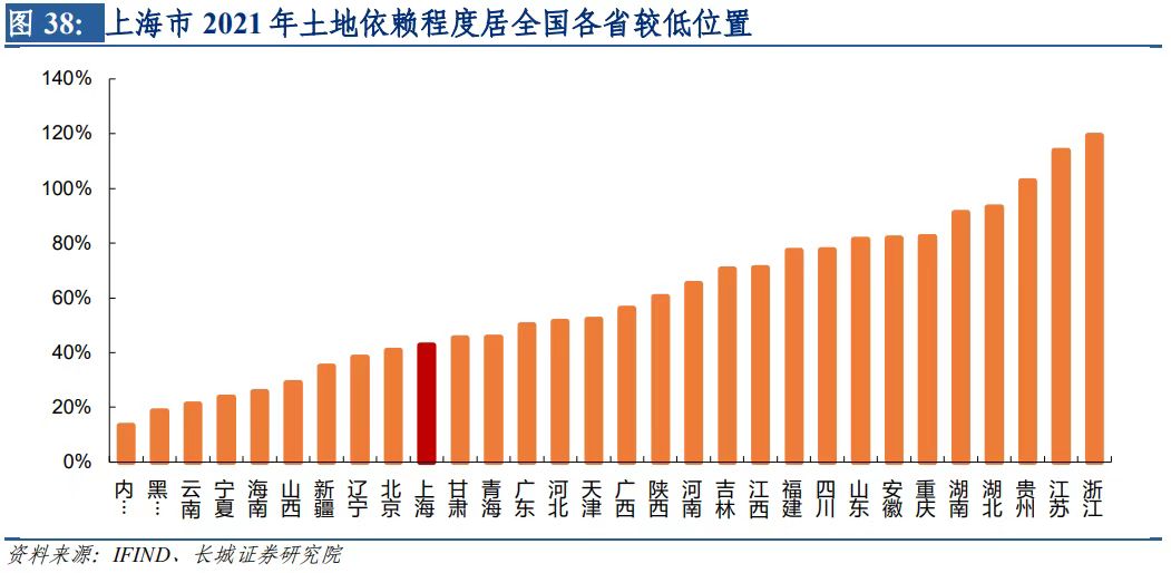 上海市财政实力雄厚,同时对土地的依赖程度较低。且我们以成交土地出让金占地方公共财政收入的比例作为衡量土地依赖程度的指标,从2021年数据来看,上海市的土地依赖度居全国各省市中游偏下水平,事实上近10年以来上海市土地依赖度一直低于30个省市的平均水平,表现出较低的土地依赖程度。从变化趋势来看,上海市近5年土地依赖度出现上升趋势,这一趋势与全国一致。我们认为目前上海在财政方面要继续控制土地财政依赖度的增长速度,提升土地利用效率,加快经济转型。