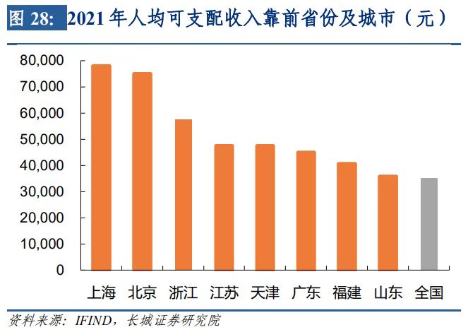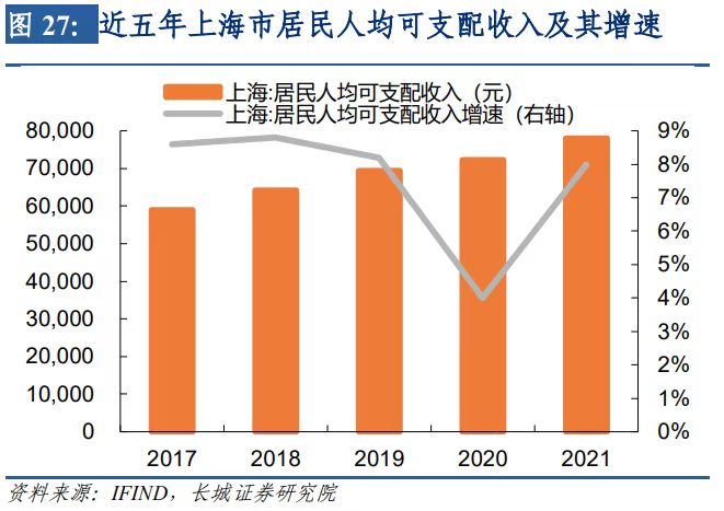 2021年,上海市居民人均可支配收入为7.8万元,同比增长8%,比全国平均水平高4.3万元,居全国首位。实际上,上海市居民人均可支配收入持续增加,其增长速度与经济增长基本同步。上海领先的居民可支配收入可能一定程度拉动了居民存款。