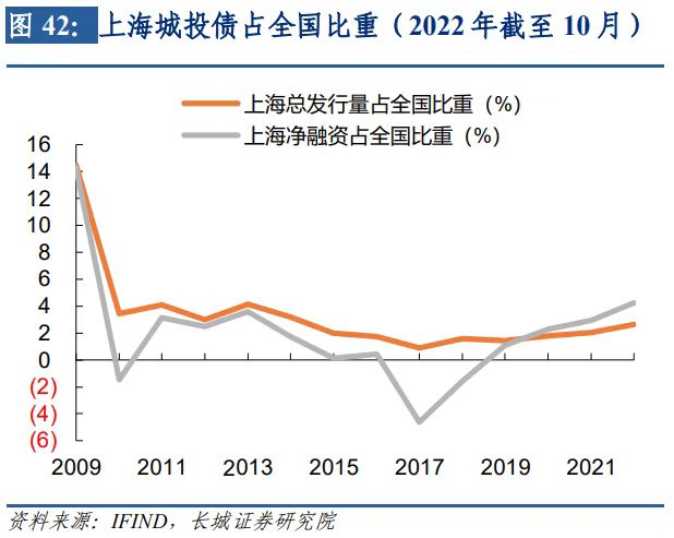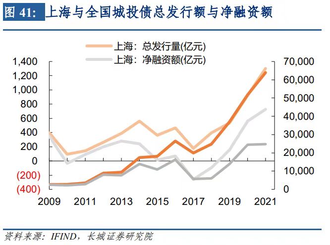 2009年以来,上海城投债净融资额发行基本呈现波动上升趋势。值得注意的是2017/2018两年,上海城投债偿还额均高于发行额,连续两年实现净融资为负,体现其对城投债务的有效控制。2019年以来,城投债净融资增速有所提高,于2021年末达到726.09亿元。今年前10月,上海城投债发行量与净融资额分别达到1276.9和564.4亿元,占全国城投债发行比重进一步上升。