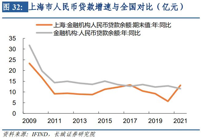 从贷款端看,自2009年以来上海市人民币贷款增速除2017年和2021年外均低于全国水平,这可能是因为上海直接融资发展较强,弥补了一部分企业信贷需求。2022年10月,上海证监局副局长王登勇在上海“奋进新征程建功新时代”党委专题系列第八场新闻发布会上介绍,十年来,上海资本市场服务实体经济的广度深度显著拓展,为上海企业提供直接融资超过4万亿元。上海市企业贷款增速自2017年下半年以来均维持在10%左右,企业信贷稳定增长并且贷款结构不断优化。中国人民银行上海总部公布的《上海市金融运行报告(2022)》显示,2021年末上海市普惠小微贷款余额为7017.51 亿元,比年初新增1810.49亿元;绿色贷款余额为6041.01亿元,较年初新增 1754.28 亿元。