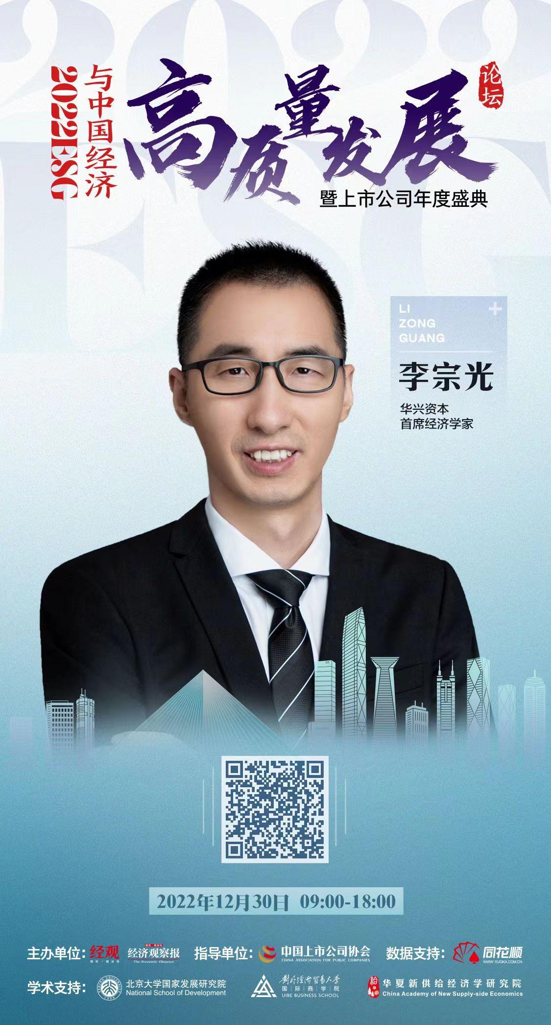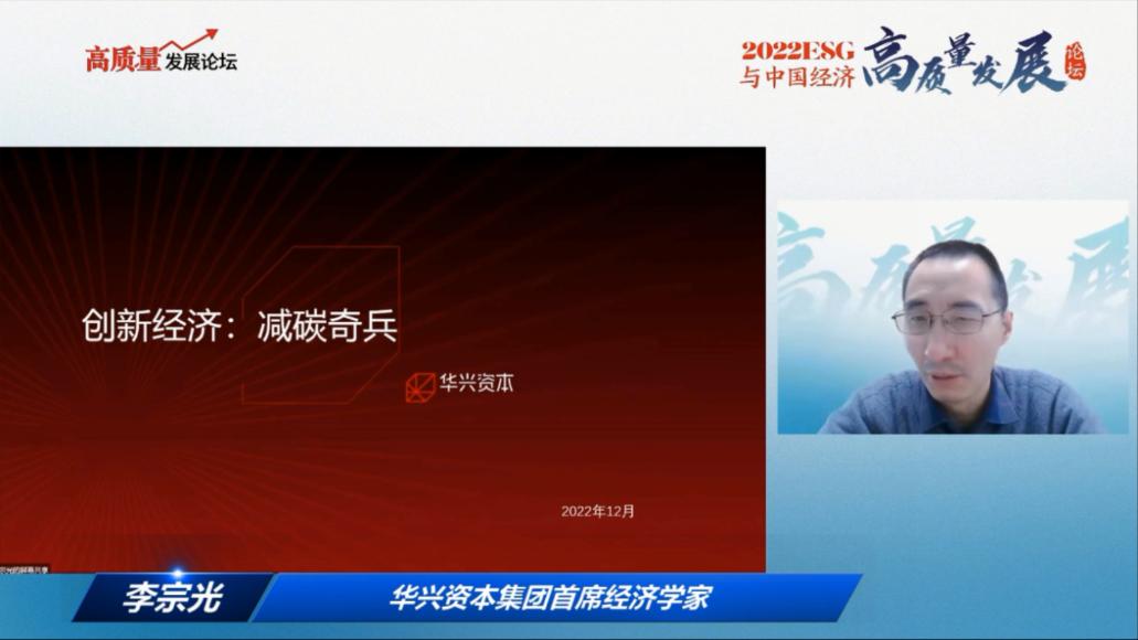 12月30日,由中国上市公司协会作为指导单位,经观传媒主办的“2022ESG与中国经济高质量发展论坛暨上市公司年度盛典”在线上举行,华兴资本集团首席经济学家李宗光分享了关于创新经济助力“双碳”目标的演讲。