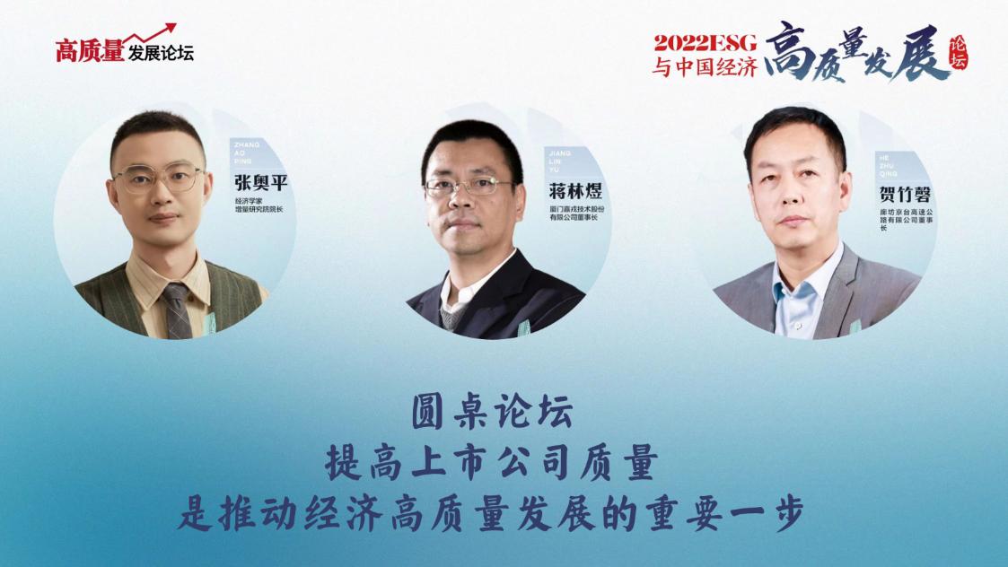 12月30日,由中国上市公司协会作为指导单位,经观传媒主办的“2022 ESG与中国经济高质量发展论坛”线上拉开帷幕。在圆桌论坛环节,经济学家、增量研究院院长张奥平,携手厦门嘉戎技术股份有限公司董事长蒋林煜、廊坊京台高速公路有限公司董事长贺竹磬,以“提高上市公司质量是推动经济高质量发展重要一步”为话题进行了深入探讨。