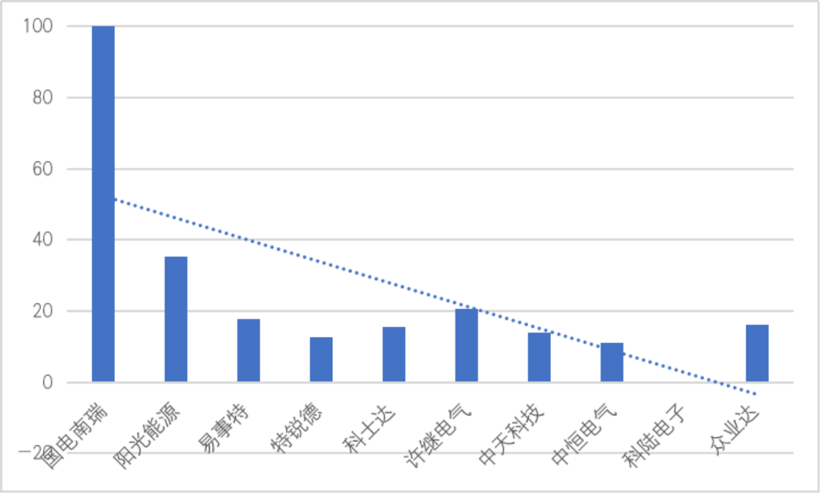 在品牌优势值方面,与其它企业相比,国电南瑞在“新能源充电桩”行业处于首位,按指数计算,国电南瑞2021年品牌优势值为100,居于行业首位。但也能够看到,该行业内品牌优势值处于一家独大的状态,除国电南瑞与其它企业拉开了巨大差距外其余企业评分相差不大,说明头部效应明显。