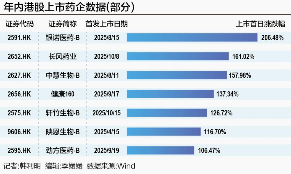 港股市场方面,今年创新药企“上岸潮”持续升温。21世纪经济报道记者梳理Wind医疗保健板块数据显示,年内已有21家企业登陆港交所,且多家新上市药企首日表现亮眼。例如银诺医药首日涨跌幅高达206%,映恩生物、中慧生物、劲方医药、长风药业、轩竹生物等企业首日涨跌幅均超105%。