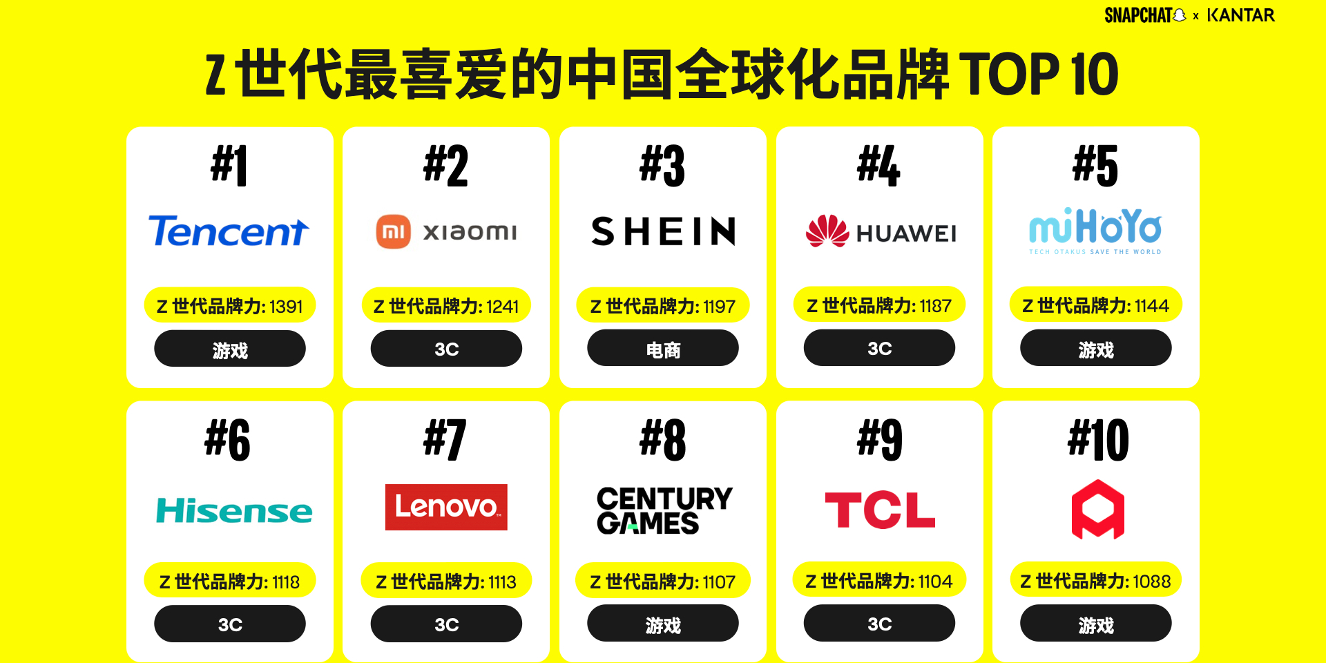 10月31日,Snapchat 携手凯度(KANTAR)正式发布首个 “Z 世代最喜爱的中国全球化品牌 50 强”榜单。腾讯游戏、小米和 SHEIN 在榜单中脱颖而出,位居前三。同时,双方还发布了《Z 世代视野下的中国品牌全球化》白皮书,为中国品牌打造全球竞争力提供了全新洞察。