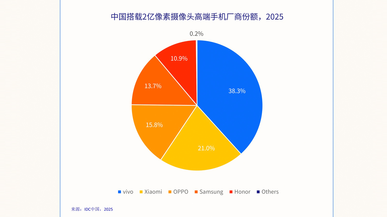 经济观察网 3月6日消息,权威机构IDC最新发布的《2亿像素摄像头进入全面普及阶段》报告指出,中国手机市场迈入2亿像素摄像头普及阶段。其中vivo凭借38%的市场份额,在600美元以上的高端价位稳居榜首,以绝对优势大幅领先,小米、OPPO等紧随其后。