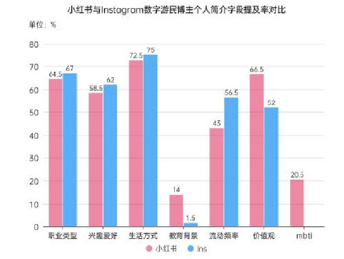 个人简介是自我定位的浓缩体现,差异显著(图17)。小红书博主简介中,标注教育背景(如名校学历)和MBTI人格类型的比例明显更高。前者折射了中国社会的“学历崇拜”传统,后者则显示MBTI已成为本土互联网重要的“社交货币”,用于快速标签化身份、寻求群体认同。Instagram简介几乎不见MBTI,更侧重展示具体技能、作品集、商业服务与成就。