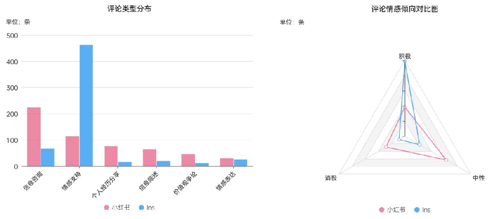 图15 小红书与Ins评论类型分布 图16 小红书与Ins评论情感倾向对比