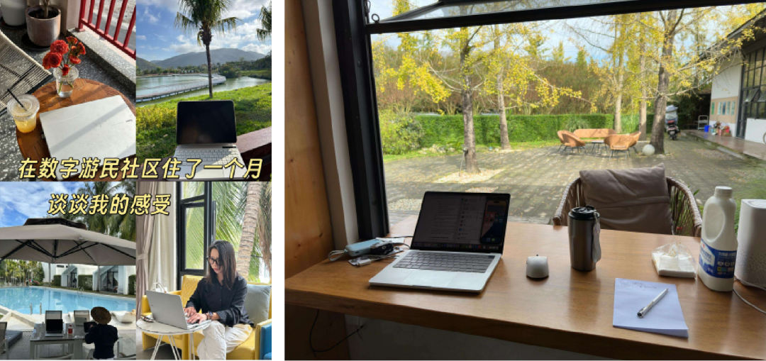 小红书图片中“工作场景”占比高达45%,显著高于Instagram的21.8%。在包含人物的图片中,人物处于“工作状态”(使用电脑)的比例高达65%(Instagram为39%)。象征远程办公的核心符号——笔记本电脑(出现率54%)、咖啡杯(39%)、绿植(48%)——出现频率均显著高于Instagram。视觉风格上,小红书图片的文字内容占比高达66%,多为招聘信息、技能标签等实用文本,且四宫格拼图(17%)等复合排版形式较常见。其自然意象多呈现山脉、沙丘、田野,与工作场景深度融合,形成 “人在景中作” 的视觉叙事(图3、图4)。宋代郭熙在《林泉高致》提出“可行可望可游可居”,许多国内数字游民社区也依照这一理念进行设计。例如,大理的NCC(Nomad Co-Living & Co-Creating)社区、四川资阳的DNβ数字游民村等,其官方或用户分享的图片都强调社区坐落于自然山水之中,工作和生活空间与自然环境有机交融。(图5、图6)