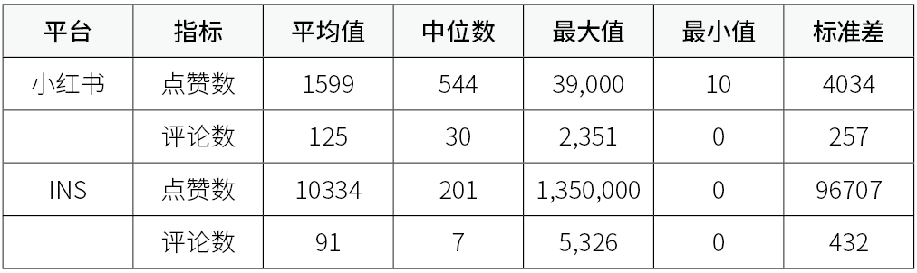 对互动数据的量化分析揭示了两种截然不同的社区参与模式与生态氛围。如表1及图11所示,小红书的互动量(点赞、评论)分布相对集中,方差较小,且整体互动率(基于粉丝量的点赞率与评论率均值)高于Instagram。点赞数与评论数呈较强的正相关关系(图12),表明用户既有点赞认可的习惯,也积极参与评论讨论,体现了强社区互动与公共讨论属性。反观Instagram,互动数据呈现显著的“长尾分布”(图13),即存在极少数获得数百万点赞的“病毒式”内容,但大量帖子互动平平。其点赞数与评论数的相关性较弱,普遍存在“高点赞、低评论”现象,用户更倾向于进行轻量化、低门槛的点赞互动。这种差异与平台算法机制有关:Instagram的算法易于强化头部内容的曝光,导致“赢家通吃”;而小红书的推荐算法相对更均衡,给予中腰部内容更多曝光机会,鼓励了基于内容的深度交流。